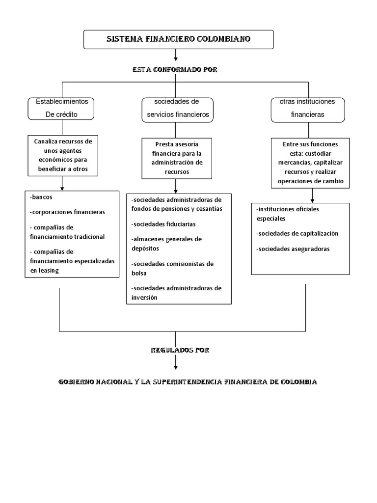 El sistema financiero colombiano ha exhibido una expansión en la última década sustentada tanto en la creciente intermediación tradicional realizada por los EC como en la oferta de otros servicios financieros e. Ii las sociedades de servicios financieros SSF y iii otras. Mapa conceptual de la conformación del sistema financiero Colombiano características y principales leyes que lo rigen.